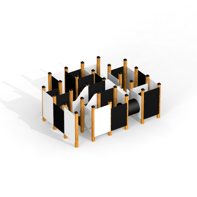 Тази конструкция е идеална за интегриране в зелени площи, паркове и детски площадки, като предлага интересно пространство за развитие на моториката и въображението на децата, стимулирайки социалното взаимодействие и активния отдих.