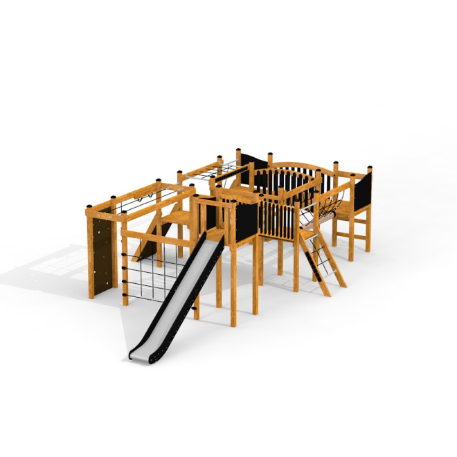 Тази многофункционална площадка е идеална за паркове, училищни дворове и обществени пространства, където се цени активният начин на живот и развитието на моториката и социалните умения на децата. Естетиката в природен стил позволява плавно вписване в зелена среда.