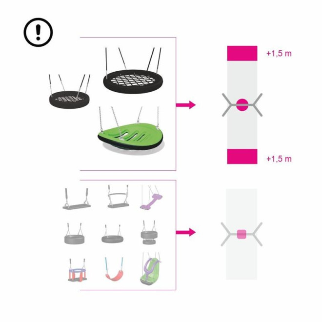 С височина, проектирана за оптимална безопасност и с критична височина на падане, която съответства на изискванията за безопасна игра, тази люлка изисква специално защитно покритие на повърхността. Подходяща е за деца от 2 години, като осигурява стабилна и сигурна среда за игра.