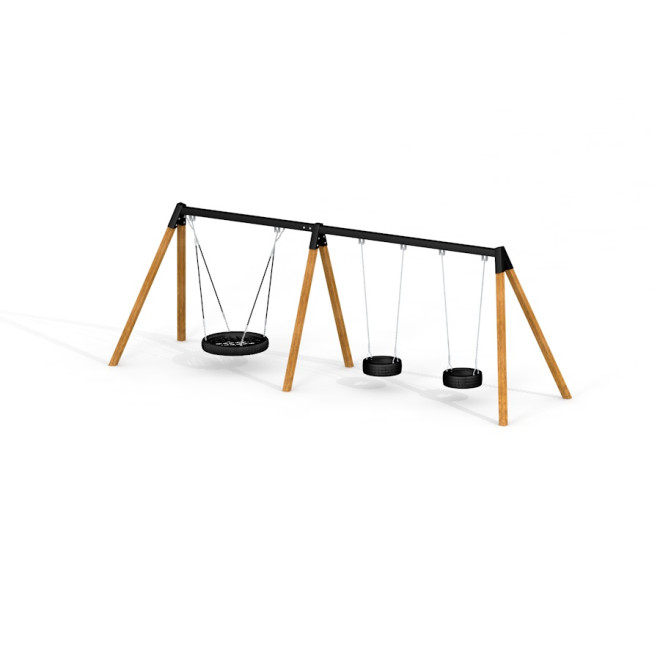 Double Bay Wooden Swing с един гнездовиден седалков елемент и два гумени седала е идеален за паркове, училищни дворове и обществени площадки, където разнообразието и безопасността са от първостепенно значение. Тя предоставя възможност за социална игра и развитие на двигателни умения в открита и приятелска среда.